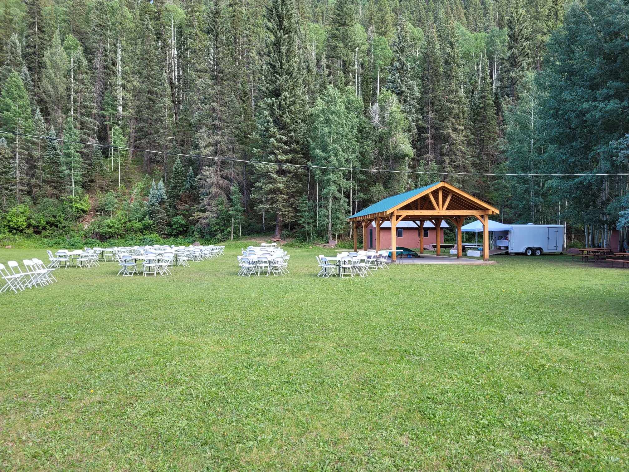 - Main lodge and outdoor pavilion provide a perfect gathering place to enjoy meals, play games or chat around our lodge fireplace